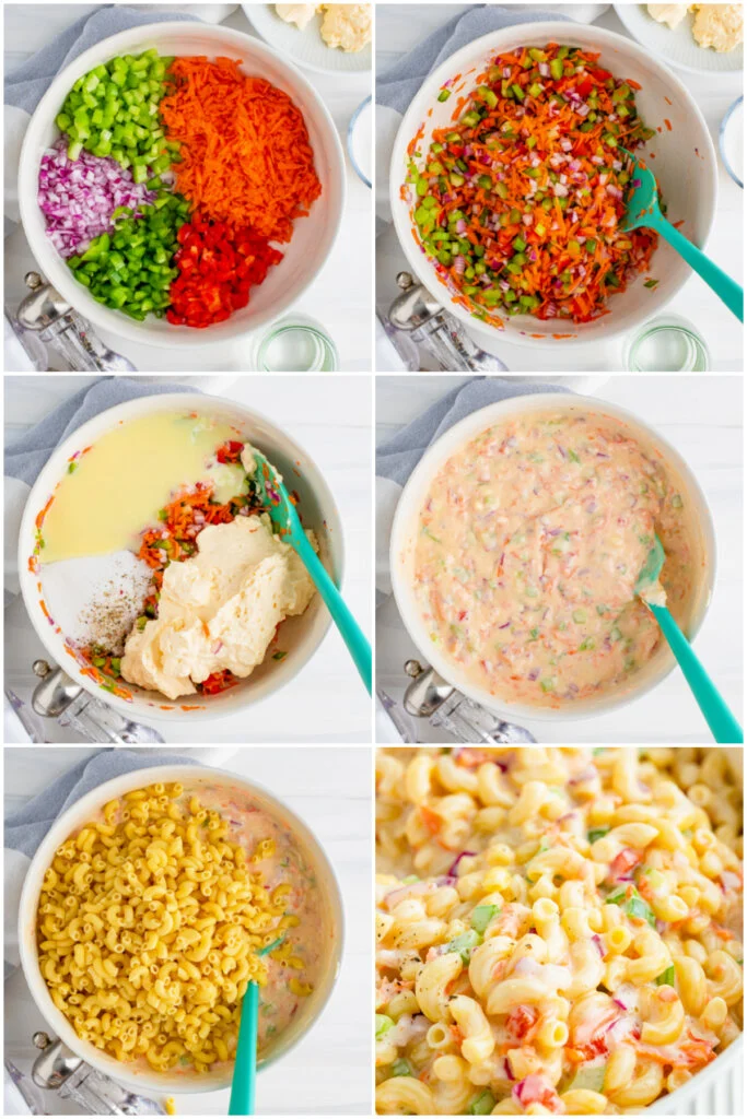 2️⃣큰 그릇에 당근, 적양파, 청피망, 붉은 피망, 셀러리를 넣고 섞습니다. 마요네즈, 가당연유, 설탕, 식초, 소금, 후추를 넣고 섞습니다. 익힌 마카로니를 넣고 살살 버무립니다.